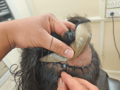 3. Secure the patch with threads to the natural hair.